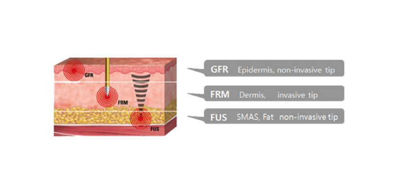 Ultrasound waves are beamed to a targeted depth of the skin where thermal heat energy treatments stimulates the growth of new healthy collagen for prolonged and more intensive tightening.